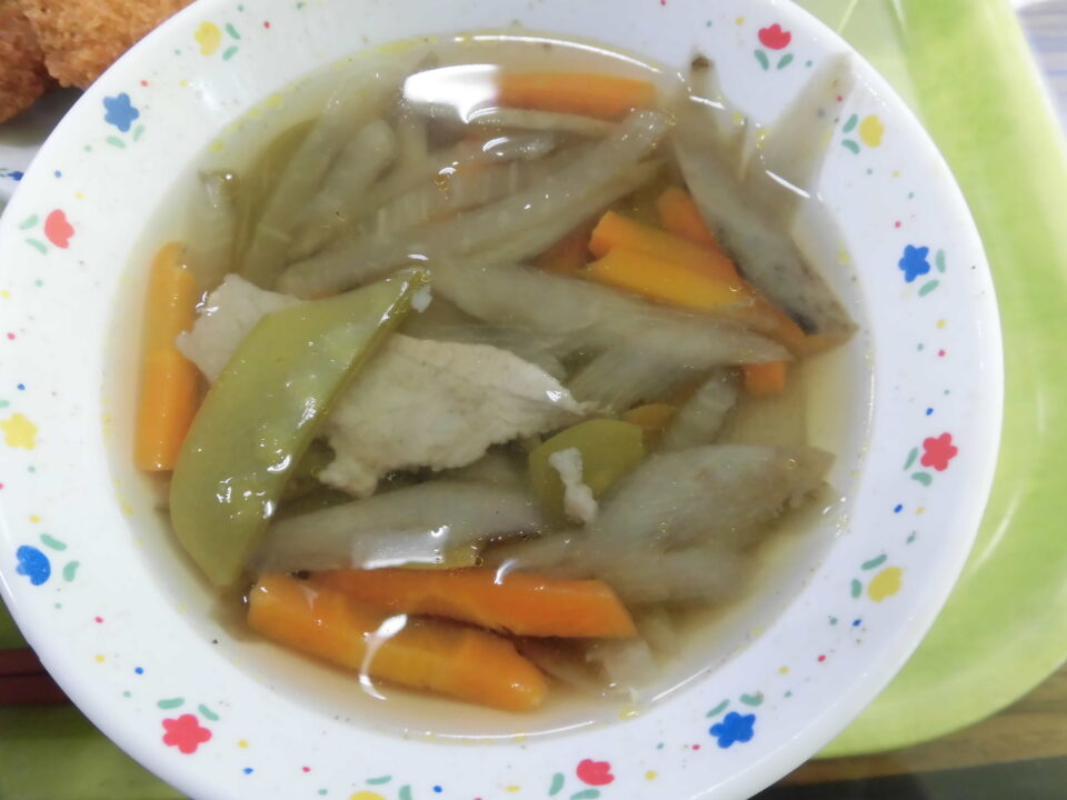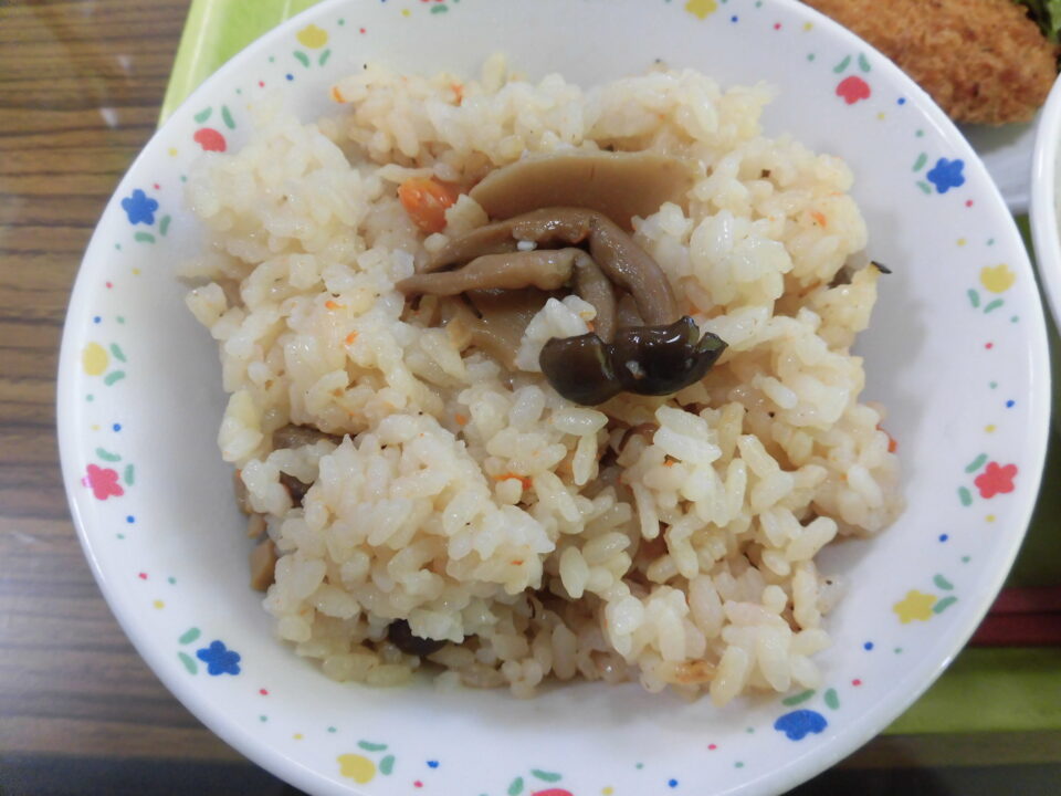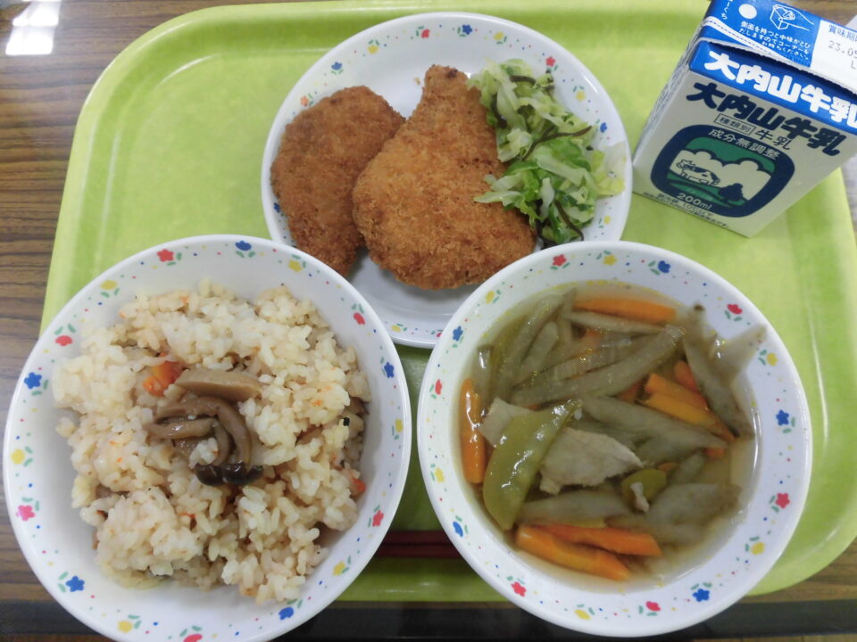 献立は、たけのこご飯、牛乳、かつおフライ、春キャベツの塩昆布和え、さやえんどう入り沢煮椀でした。