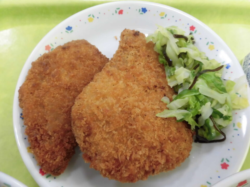 かつおフライは、大きい方が3年生~6年生の子、小さい方は、1年生と2年生の子が食べる量です。