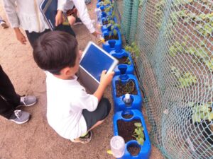 自分で植えた野菜をじっくり見て、タブレットでも写真を撮りました。