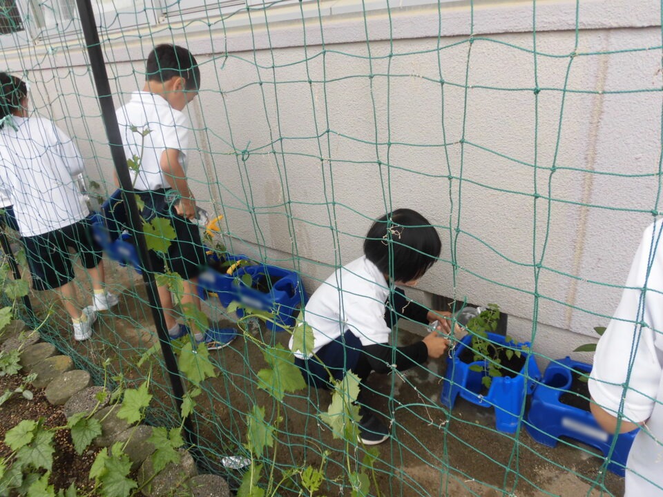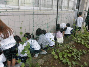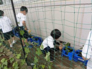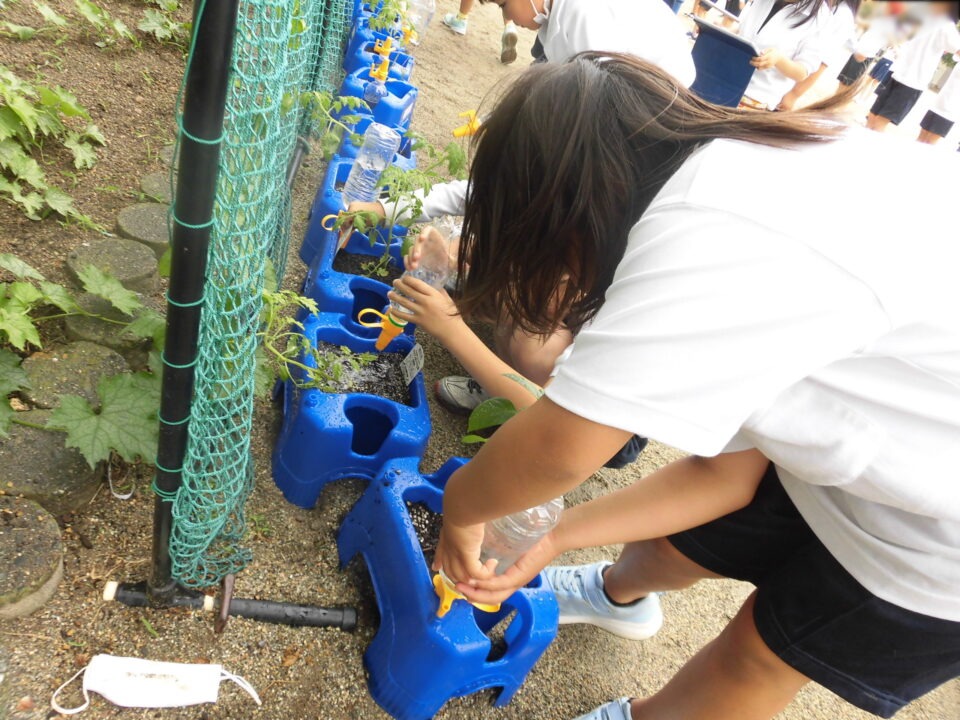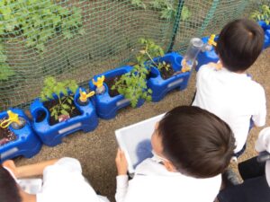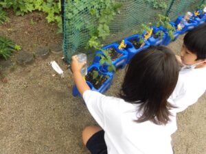 昨日、植えた野菜(ミニトマト、オクラ、枝豆、ナス)の観察をしました。
