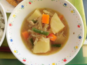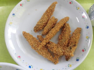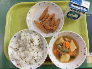 今日の給食は、菜飯、牛乳、きびなごのかりかりフライ、新じゃがのそぼろ煮でした。そら豆の塩ゆでは、天候不順等のため、そら豆が入荷困難となったそうです。残念でしたね。